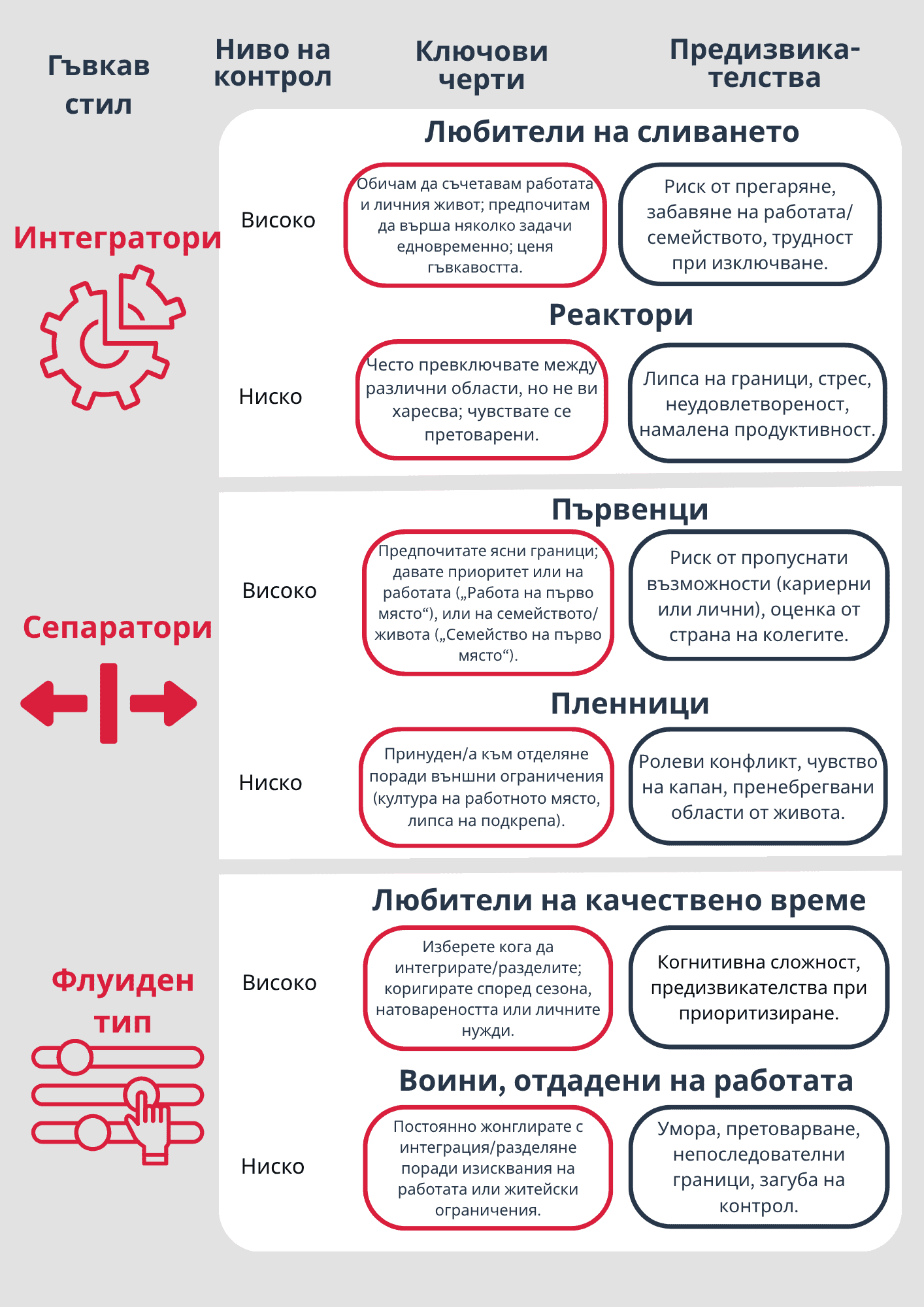 В днешния свят, в който границите между работата и личния живот стават все по-размити, хората управляват взаимодействието между тези две сфери по различни начини. Професор Елън Ърнст Косек („The CEO of me“), водещ експерт в областта на интеграцията между работа и личен живот, въведе концепцията за flexstyles (гъвкав стил) – индивидуални предпочитания за управление на границите между работата и личния живот – като подчерта, че ключът към благополучието не се крие в „правилния“ стил, а в усещането, че имаш контрол и че си в хармония с личните си ценности.