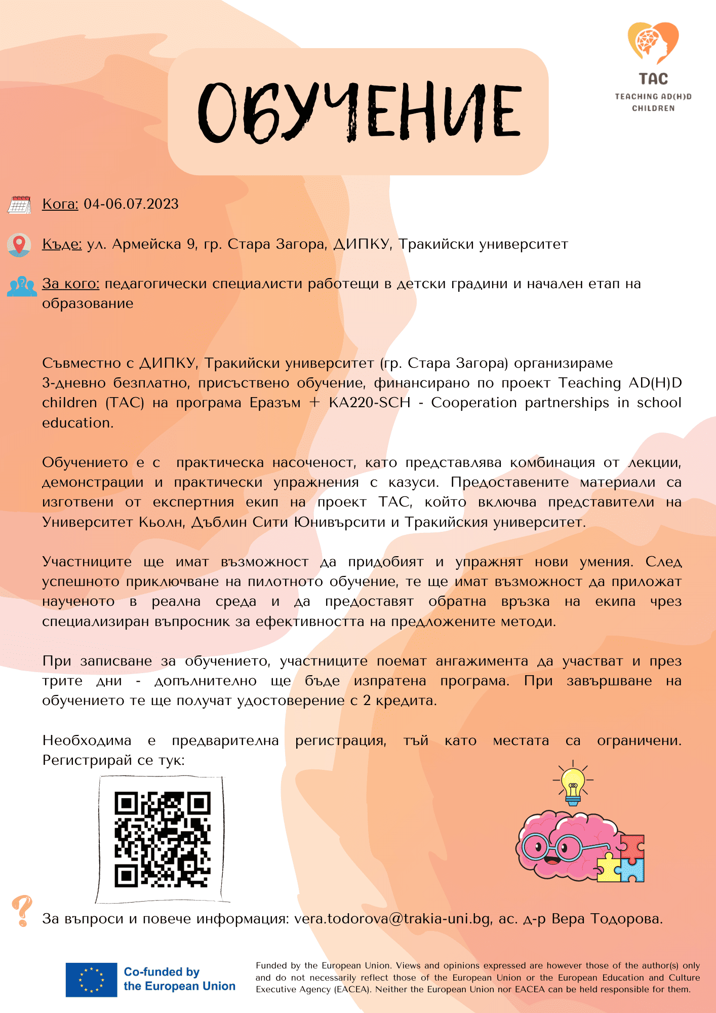 Повече за проекта Teaching AD(H)D children (TAC) ще научите тук, а във фейсбук следете за новостите, свързани с него.