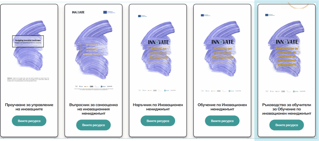 Проектът INNOVATE е на финалната права и с това обявяваме, че последният ресурс – Ръководство за обучители за Обучение по иновационен мениджмънт, е вече наличен на сайта.